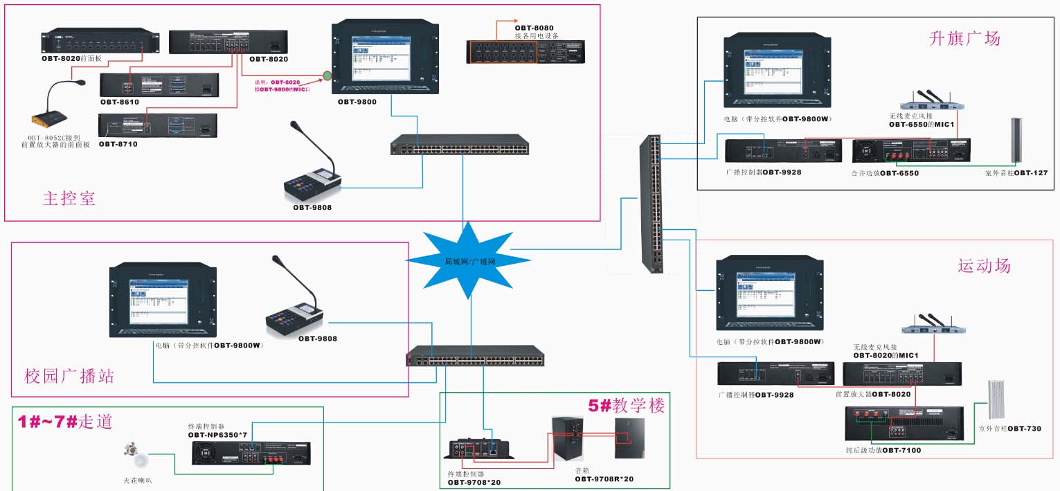 4、運動場廣播:學生活動的主要場所,實現早操和運動會的廣播需求,在操場廣播室可以實現領導遠程講話;有室外無線操作、遠程無線廣播等功能,滿足室外廣場、運動場等區域使用。